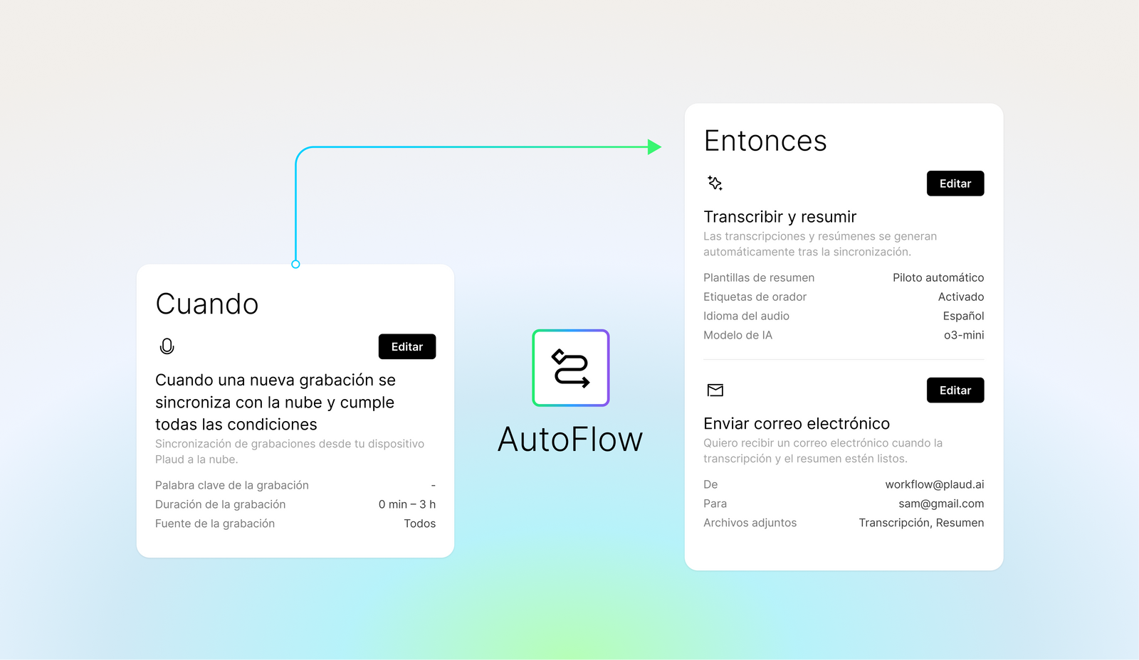 Automatiza tu flujo de trabajo para ser más eficiente Configura AutoFlow una vez y deja que se encargue del trabajo duro. Se encarga automáticamente de la transcripción, el resumen y la entrega, por lo que facilita enormemente el trabajo y lo hace más rápido y fiable.