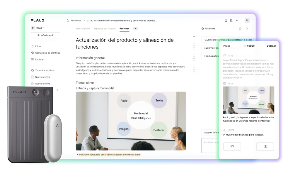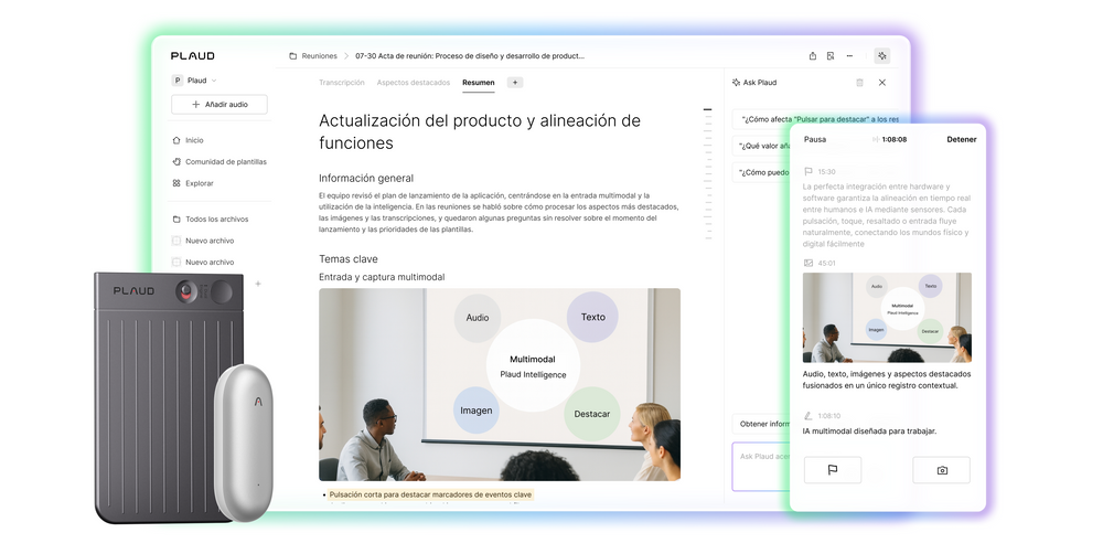 - Plaud AI sintetiza automáticamente la información de todas tus conversaciones grabadas.