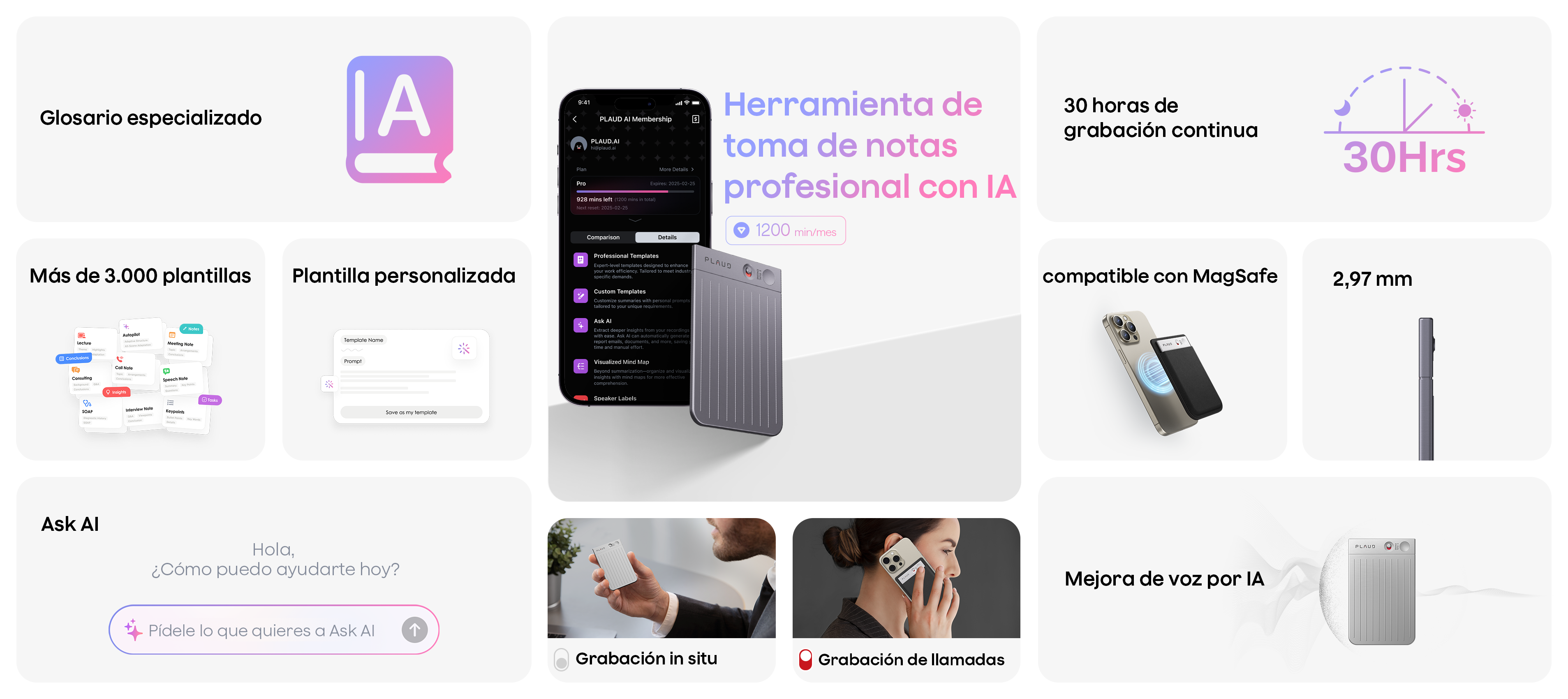Participa en cada conversación y deja que Plaud Note grabe, resuma y organice las decisiones clave, los siguientes pasos y las ideas.